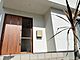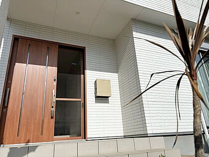 【玄関前スペース】白にブラウンの扉が映えます。玄関まではスロープと階段の両方で移動できます。