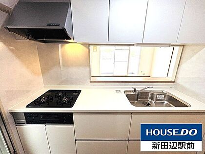 コンロはガス3口です。お手入れはしやすい設計。シンクも広めでいいですね。
