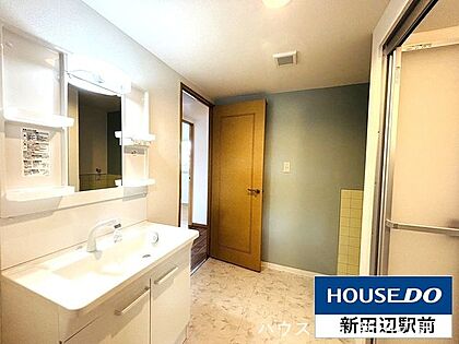 清潔な洗面化粧台です。毎日の身だしなみチェックはこちらでどうぞ。小物を置くスペースもあって使い勝手便利ですね。