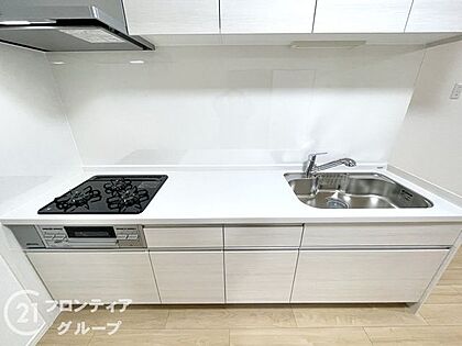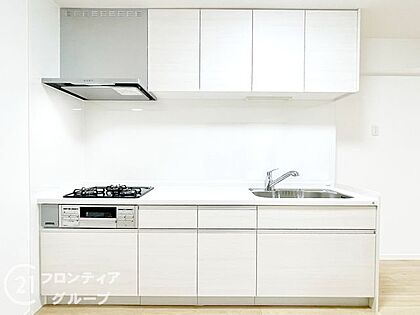 収納力ある吊戸棚付きのシステムキッチンです。ご家族の顔を見ながら料理を楽しんで頂けますね