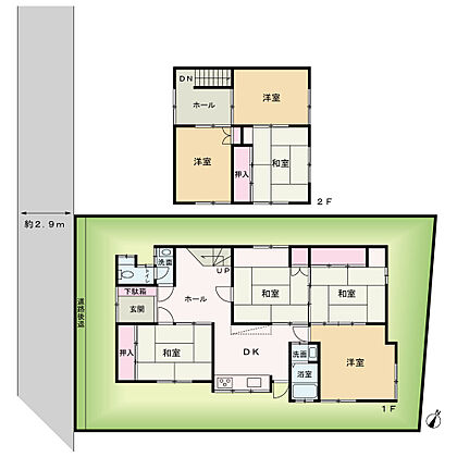 【接道】 一方 ( 公道 北西 2.9m ) 1階洋室、2階増築部分未登記あり。現状延べ床面積 約127.52平米です。 |