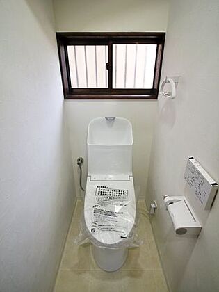 1階温水便座付きトイレの様子。小窓を空ける事で換気もしやすく、明るいトイレです!