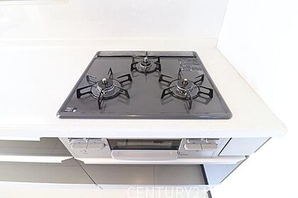 複数同時調理可能な3口コンロ。メインに副菜、お味噌汁など同時調理可能です。魚焼きグリルもついているので、お魚好きなお父さんも大満足。