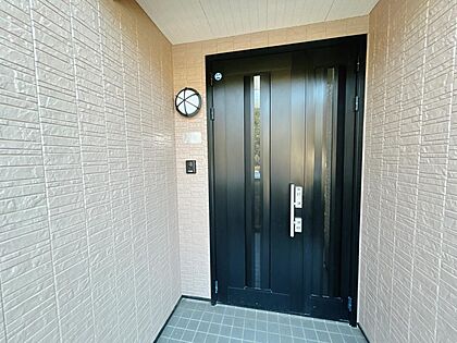 【リフォーム済】玄関外部の写真です。玄関は鍵の交換を行いました。家の顔である玄関がきれいだと毎日の帰宅が楽しみですね。