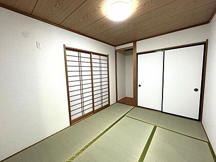 【リフォーム済】1階和室の写真です。クロスの張替え、畳の表替えを行いました。い草の香る和の空間で、ゆったりとした時間を過ごしませんか。客間としての利用も良いですね。
