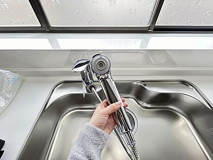 【リフォーム済】キッチンはハウステック製の新品に交換。水栓金具は「かゆい所に手が届く」シャワータイプ。浄水・原水の切り替えがワンタッチで出来ます。一体型の浄水器なので汚れにくくお手入れ簡単ですよ。