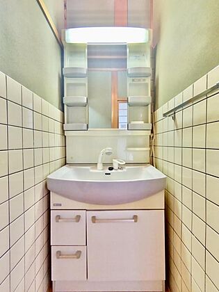 【リフォーム済】洗面化粧台はクリーニングと通水確認を行いました。小物を置ける棚が多いので、使い勝手がいいですね。