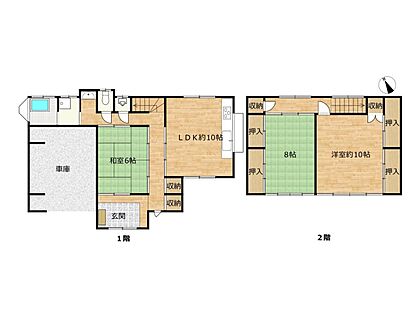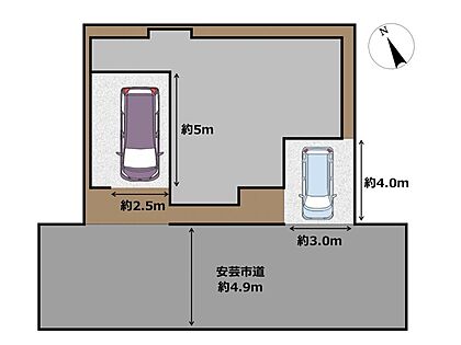 【駐車場配置図】車は図のように駐車可能となります。普通車1台、軽自動車1台駐車可能です。前面道路は約4.9mと広いので、毎日の駐車はストレスフリーですよ。