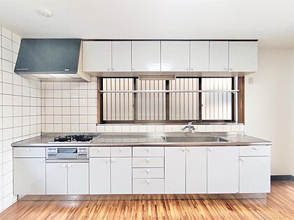 【リフォーム済】キッチンです。クリーニング、動作確認及び通水確認を行いました。全長3.5mと広々サイズのキッチンなので、狭さによるストレスとはおさらばですね。