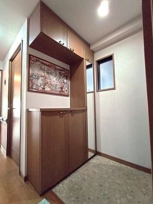 玄関には姿見と飾り棚つきの下駄箱があります◎