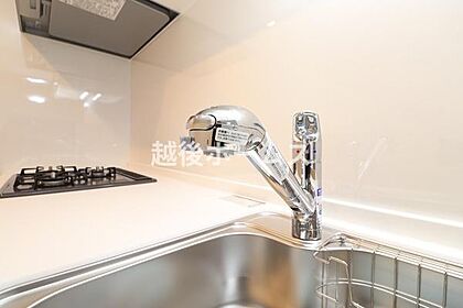キッチンは使いやすい引き出し式のタイプです。浄水器一体型の水栓も標準装備しています。
