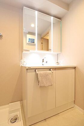 3面鏡のシャンプードレッサーは収納充実!朝のお支度も楽々できますね。