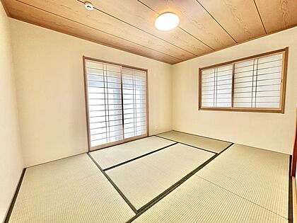 •  【リフォーム済写真】1階南側にある6畳の和室です。畳の表替え、ふすま張り替え、障子新設をしました。来客時は玄関側からすぐお通しできるので、客間としてもお使いいただけます。