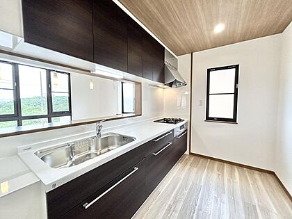•  【リフォーム済写真】キッチンはハウテック製のシステムキッチンに新品交換しました。床はフロアタイルの重ね張り、壁・天井のクロ張替え、照明器具交換を行いました。対面型なので、ご家族と会話しながらお料理を楽