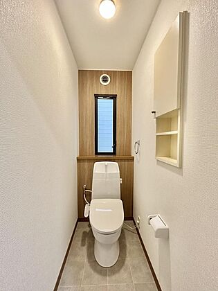 •  【リフォーム済写真】1階トイレ 温水洗浄便座トイレに新品交換しました。壁・天井のクロス、床のクッションフロアを張り替え清潔感溢れる空間になりました。