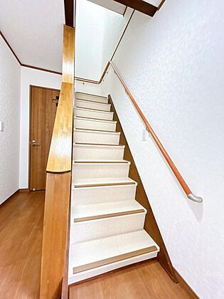【リフォーム済】階段の写真です。階段には手すりを付けました。階段には踊り場があり、上り下りの負担は少ないです。