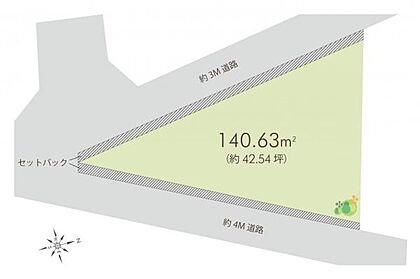 | 土地面積/坪(坪単価) | 140.63m2/42.62坪(18.50万円) | 代表的な接道 | 角地 公道 東 4m、西 3m ※詳細は備考欄をご確認ください |