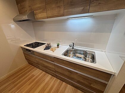 キッチン収納は奥まで見やすい引き出し型、上部にも収納あり★