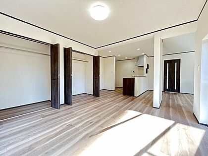【リフォーム済】1階約25帖LDKです。LDKはリフォームで拡幅しました。床フローリング張、天井・壁のクロス張替え、建具交換、照明交換を行いました。