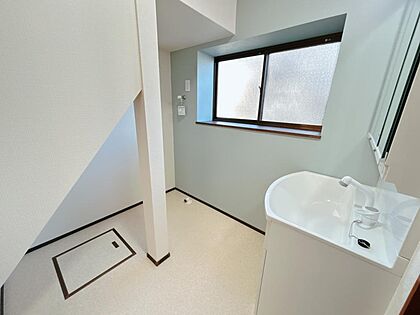 【リフォーム済】洗面脱衣所です。床クッションフロア張り、天井・壁のクロス張替え、照明交換を行いました。