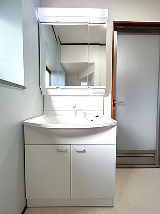 【リフォーム済】洗面化粧台は三面鏡タイプを設置しました。朝の支度がしやすく、見た目もすっきりします。