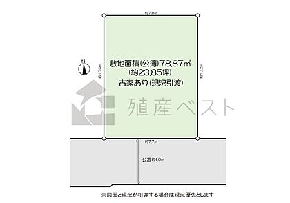 土地面積/坪(坪単価) 78.87m2(登記簿)/23.9坪(250.20万円) 代表的な接道 一方 公道 南 4m