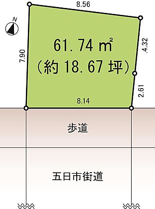 土地面積/坪(坪単価) 61.74m2(実測)/18.71坪(454.30万円) 代表的な接道 一方 公道 南東 15m