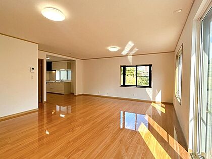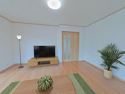 【リフォーム済】キッチンから見たリビングの写真です。フローリング張り、壁天井クロス仕上げ、照明新品交換等を行いました。