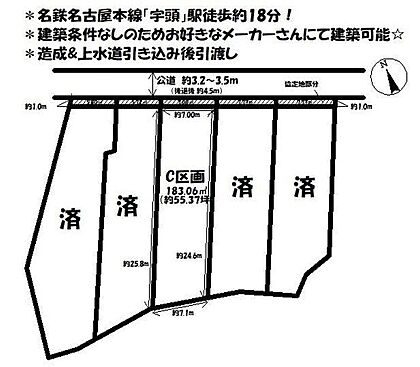 | 土地面積/坪(坪単価) | 183.06m2/55.47坪(35.20万円) | 代表的な接道 | 公道 北 3.2m ※詳細は備考欄をご確認ください |