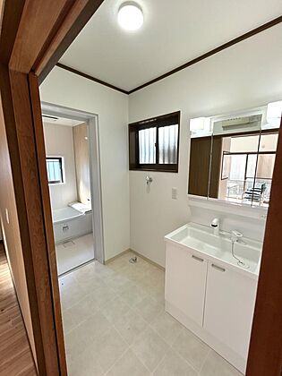 (リフォーム済)洗面台は三面鏡付きを新設しました。鏡裏に収納スペースがあります。扉を閉じると三枚の鏡がフラットになりますので大きな一面鏡としても使えますよ。
