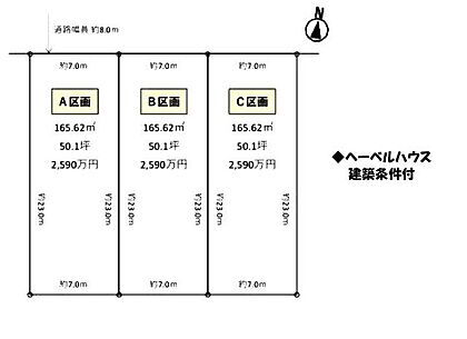 | 土地面積/坪(坪単価) | 165.62m2/50.19坪(51.60万円) | 代表的な接道 | 北 8m ※詳細は備考欄をご確認ください |