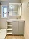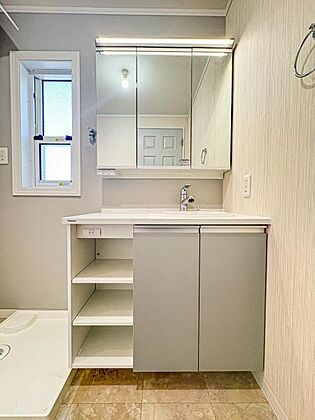 【収納豊富な三面鏡洗面台】左右の鏡を開いて三面鏡としても使える大型の鏡を設置。鏡の裏には、洗面用具などを機能的に収納できるスペースを設けています。