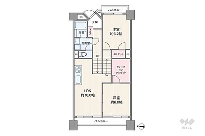 間取りは専有面積67.88平米の2LDK。LDK約10帖のプラン。バルコニー面積は7.15平米です。