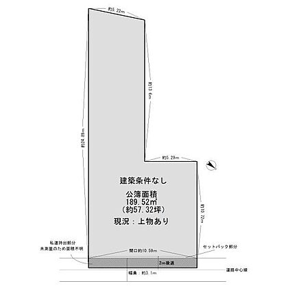 | 土地面積/坪(坪単価) | 189.52m2(実測)/57.43坪(18.30万円) | 代表的な接道 | 一方 ※詳細は備考欄をご確認ください |