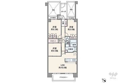 間取りは専有面積66.87平米の3LDK。LDK約16.0帖の横長リビングのプラン。バルコニー面積は7.54平米です。