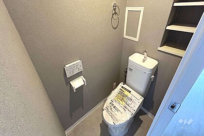〜トイレ〜2023年5月のトイレ新調済みです。棚があるため、ディフューザーを置いたり、トイレットペーパーなどをストックすることができます!