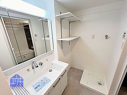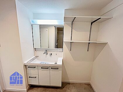 洗面台も新調!奥には可動棚がありタオル等置いていただけます。