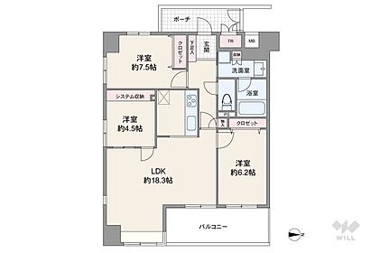 間取りは専有面積79.81平米の3LDK。玄関前に門扉付きのポーチが設けられたプライバシー性の高いプラン。全居室洋室仕様で、個室3部屋のうち2部屋はLDKからアクセスする造り。
