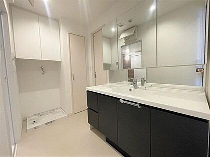 空間を収納に上手く活用した洗面室。白が基調で清潔感があります