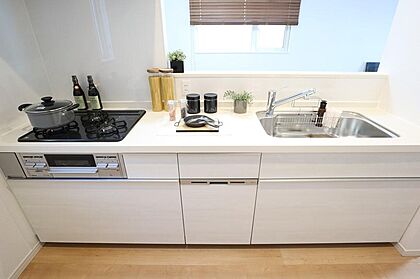 【料理がもっと楽しくなる!】広々とした作業スペースのキッチンで、家族みんなで料理を楽しんだり、カフェのような空間を演出できます。夫婦そろってキッチンに立っても調理がしやすくゆとりある広さ。