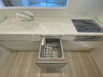 3口タイプのガスコンロは同時調理で時短。食洗機も付いています。