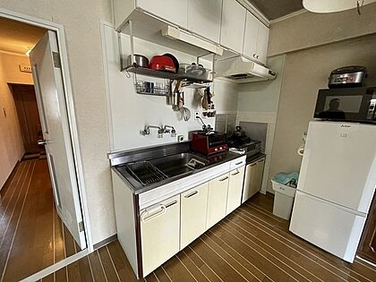 ※販売対象に家具・調度品は含まれません。シンクとコンロ下の収納に加え、吊戸棚が備わっており、鍋などをたっぷり収納できます。
