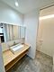 オリジナルの洗面台は贅沢にスペースを確保♪間接照明でゆとりを演出