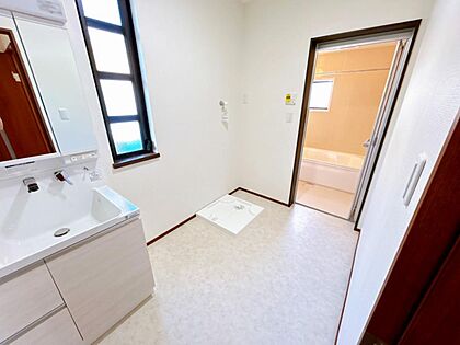 【リフォーム済み】洗面脱衣室の写真です。浴室の位置を変更して脱衣室を拡張しました。洗濯機置き場スペースも確保いたしました。床クッションフロア貼り、クロス貼替を行いました。