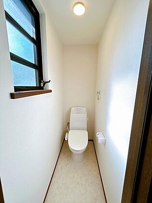 【リフォーム済み】1階トイレの写真です。新しい温水洗浄機能付きトイレに交換いたしました。床クッションフロア貼り、壁天井のクロス貼替して綺麗な空間に変わりました。