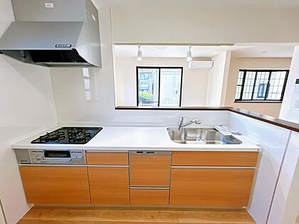 【リフォーム済み】キッチンの写真です。新しいシステムキッチンに交換しました。便利な食洗器付き。明るい対面キッチンでご家族との会話が弾みそうです。