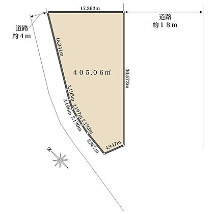 | 土地面積/坪(坪単価) | 405.06m2(登記簿)/122.75坪(10.40万円) | 代表的な接道 | 角地 公道 北西 4m、南東 18m ※詳細は備考欄をご確認ください |