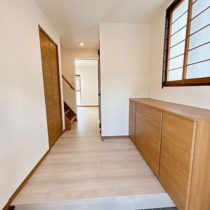 【リフォーム済】玄関に新品のシューズボックスを設置しました。ご家族の靴もすっきり片付きますね。