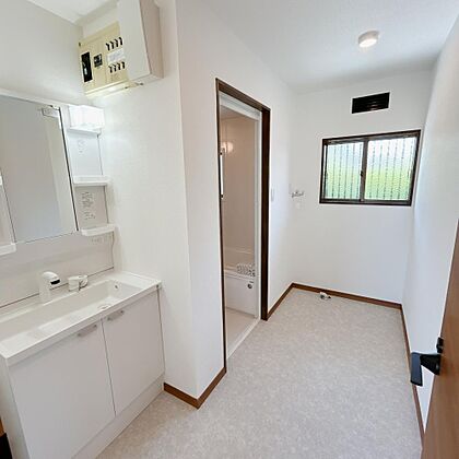 【脱衣所】脱衣所の洗面化粧台はハウステック製の新品に交換しました。間口75cmの大型の洗面ボウルは洗顔・洗髪はもちろん、つけ置き洗いにも使えます。コンセント付きです。