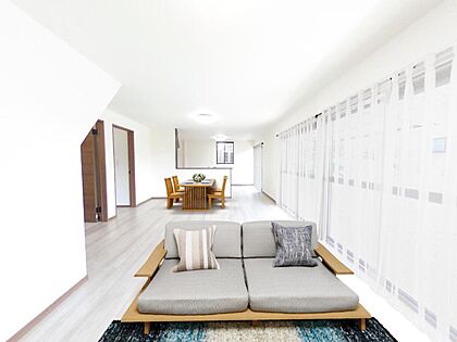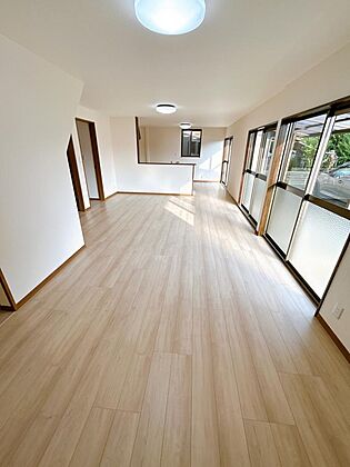 【リフォーム済】1階約18.5帖のLDKです。南面に大きな窓があるので、明るいですね。ご家族の憩いの空間に生まれ変わりました。